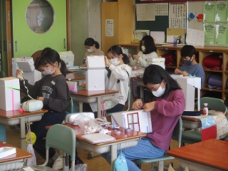 図画工作科の学習で、ダンボールの形や特徴を生かして、生活で飾ったり使ったりできるボックスを作っています。子どもたちは、形の組み合わせや色やデザインを工夫して実際に使うことを想像しながら制作を楽しんでいます。