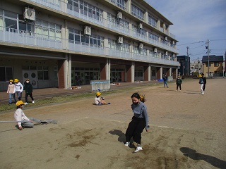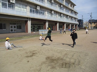 天候のよい日には、走り幅跳びの学習をしています。子どもたちは、リズムに乗った助走から、自分に合った足で踏み切って、両足着地をする練習に意欲的に取り組んでいます。