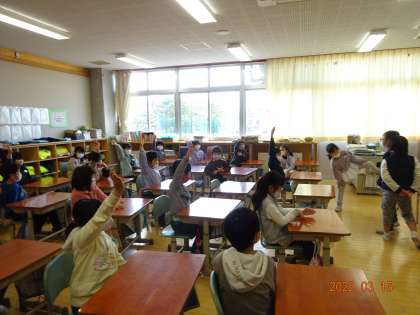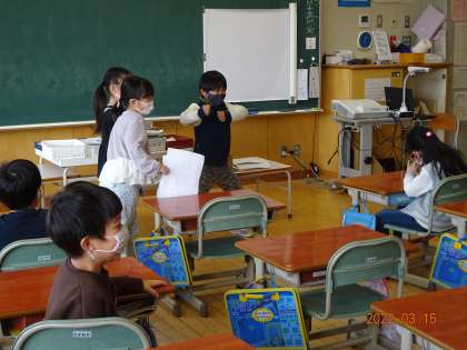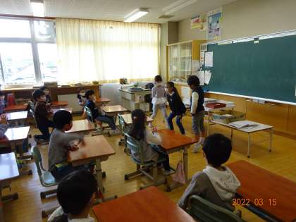 朝の学級タイムに、お笑い係のメンバーが出し物をしました。ものまね編では、うさぎやゴリラ、おすもうさんのものまねをしました。子どもたちは大盛り上がりで楽しみました。