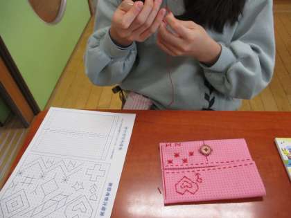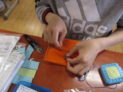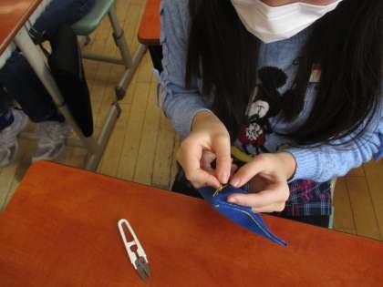 家庭科の時間に、5年生で学習した裁縫を生かして手作りのティッシュペーパー入れを作りました。なみ縫い、本返し縫い、半返し縫いなど、思い出しながら一針一針縫いました。刺繍やボタンで飾り付けをして仕上げました。