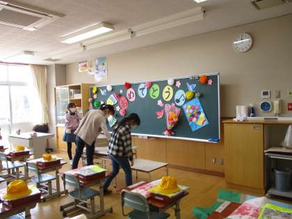 明日の入学式に向けて、式場や1年生の教室の準備をしました。また、気持ちよく1年生を迎えるため、玄関・階段や洗面所などもきれいに清掃しました。ピカピカの1年生に出会えることを楽しみにしている6年生です。