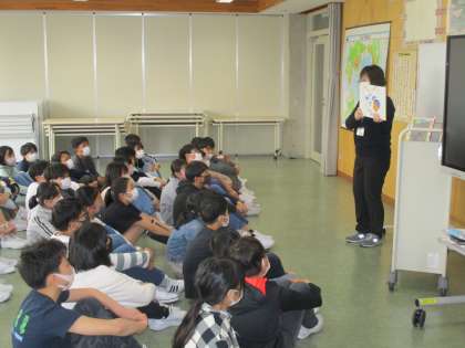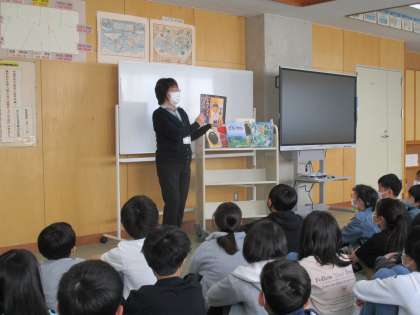 図書室の先生から、図書室の使い方の確認と、6年生の国語の教科書に登場する宮沢賢治の本の紹介がありました。「どんぐりと山猫」の紙芝居の時間には、たっぷりと宮沢賢治の世界に浸りながら、本の楽しさを味わいました。