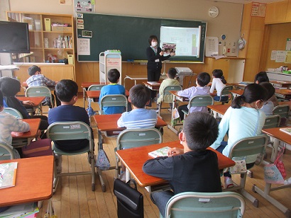 司書の先生から図書室の利用についてのお話をしていただきました。国語科の図書館たんていだんの学習にもつながる内容でした。子どもたちは、たくさんの本が種類別に10種類に分けられていることを知りました。本を探すときにぜひこの知識を使ってみましょう。