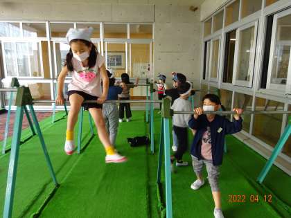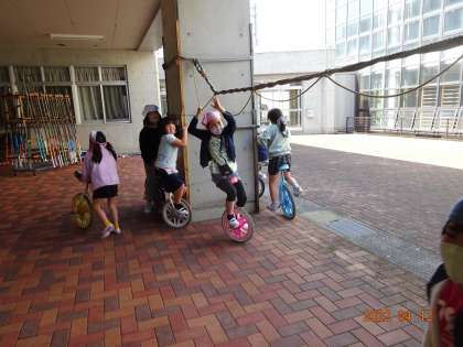 感染対策をしながら、中庭で一輪車に乗ったり、鉄棒をしたりして楽しく体を動かしました。