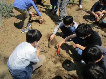 理科の学習の準備で、学校の畑にジャガイモを植えました。気持ちのよい天気の中、土を耕しながら、すくすく育つことを願って植えた子供たちです。