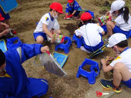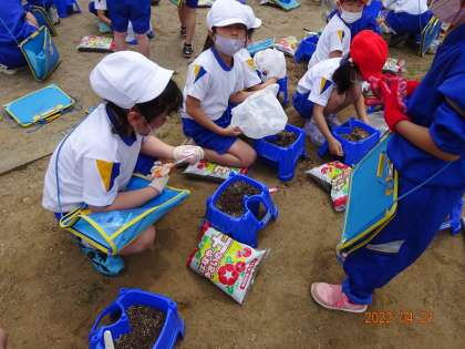 2年生の生活科では、野菜づくりの学習をします。子供たちは、何を育てようかなとワクワクしています。今日は、アサガオの土を、野菜用の土に入れ替えました。子供たちは、説明をよく聞いて活動をしていました。