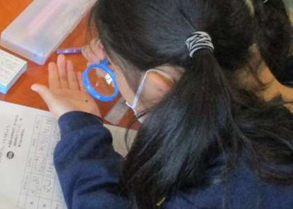 「たねをまこう」の学習で、ホウセンカ・ヒマワリ・オクラ・ピーマンの種を観察しました。それぞれの種の形や色、大きさの違いを比べながら、虫眼鏡を使ってじっくり観察しました。