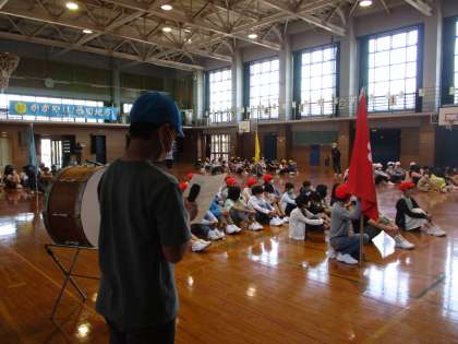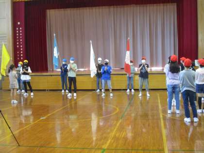 運動会に向けて高学年が体育館に集まり、結団式を行いました。各色団の団長、副団長、応援団長、応援副団長が団員に向かって意気込みを伝えました。最後に、最高の運動会になることを願って6年生がエールを送り、体育館に元気な声が響きました。