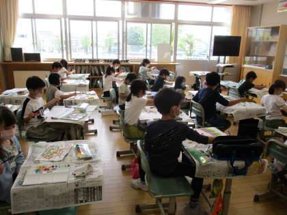 3年生になって初めての水彩道具を使った学習を行いました。混色したり、水の量や筆の使い方を変化させたりして、いろいろな表現を試しながら作品に仕上げていきました。