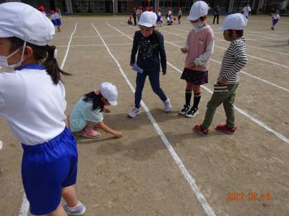 今日の朝活動に、グラウンドの石拾いを行いました。運動会に向けて、トラック内にある小石を拾い、低学年のみんなできれいにしました。本番に向けて気合い十分です。