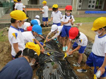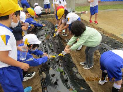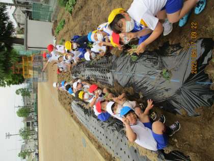 2年生の生活科では、学校の畑でサツマイモを育てます。サツマイモの苗が届いたので、みんなで苗植えをしました。初めてサツマイモの苗を見た子供たちもいて、自分の育てている野菜の苗と比べて観察していました。その後、苗植えのやり方を真剣に聞いて、ペアで協力して植えました。子供たちは、「たくさんサツマイモができるといいな」「はやくサツマイモが食べたいなあ」とワクワクしていました。秋の収穫が楽しみですね。