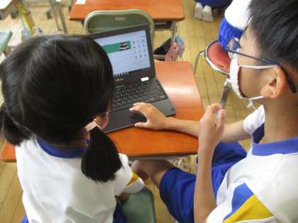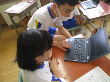 1年生と一緒にパソコンの初期設定をしました。「ここを押してね」「やり方、分かる?」など優しく教えながら、1年生とのふれあいの時間をもつことができました。