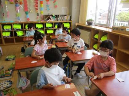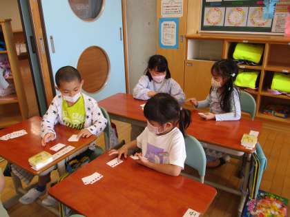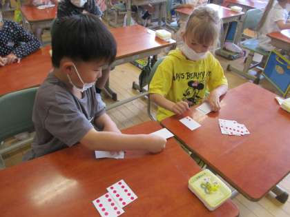「どちらが大きいかな」の学習で、数カードを使ったゲームをしました。同時に出したカードを見合って、「負けた。」「やったあ、大きい。」などと言いながら、数の大きさを認識していました。