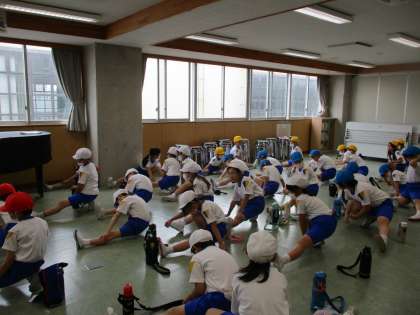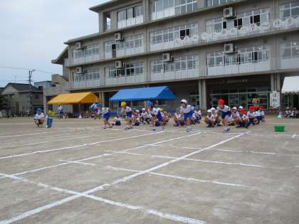 ついに、運動会本番を迎えました。中学年の部が始まる前に、まずは校舎内で準備運動をしました。その後、開始時刻を待つ間に、意気込みを聴き合いました。これまでの練習の成果を発揮し、おうちの人によい姿を見てもらおうと張り切る子供たち。50m走では、スタート時の体勢や腕の振りに気をつけて走りました。