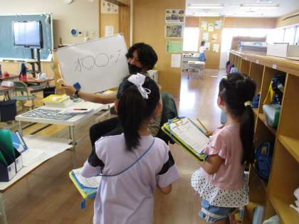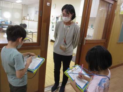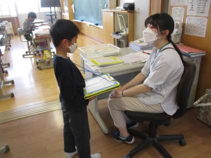 「学校たんけん 先生となかよくなりたいな」の学習で、先生にインタビューを始めました。先生に挨拶したり、聞きたいことを考えて質問したりしながら、いろいろな先生と関わりました。