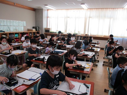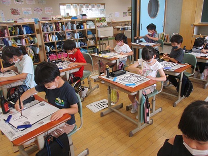 書写の時間に、初めての毛筆を行いました。まずは準備、片付けの仕方を覚えました。その後、墨汁で線を書いて筆の書き心地を試しました。