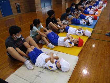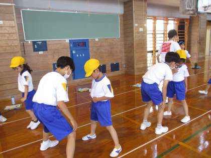 今日は、1年生が初めての体力テストをします。そこで、6年生がテストの仕方をアドバイス。「ここでとまるんだよ」「手は曲げてね」などと、お兄さん、お姉さんぶりを発揮しました。これからも、いっしょに活動をしていくことに喜びを感じた6年生でした。