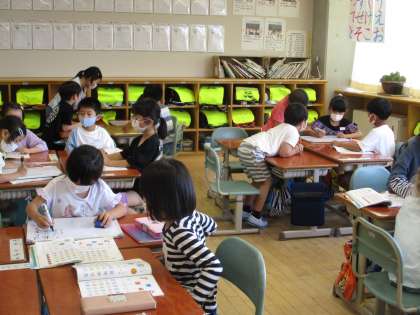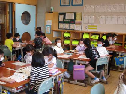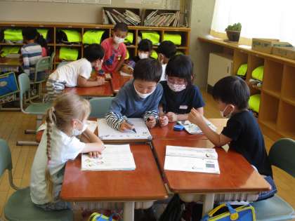 「あいうえおであそぼう」の学習で、しりとり遊びをしました。時間内にいくつの言葉をつなげることができるか、グループで言葉を出し合いました。