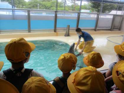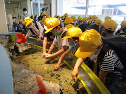 館内では、グループで見たいところを話し合いながら、いろいろな水生生物を見たり触れ合ったりしました。館内の見学後は、近くの公園で昼食をとりました。