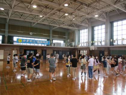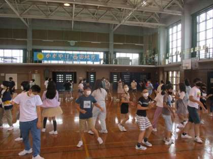 宿泊学習での活動の一つにキャンプファイヤーがあります。そのプログラムの中にフォークダンスがあり、練習をしました。「コロブチカ」の曲に合わせて、足を上げたり、手を広げたりしながら楽しく踊りました。