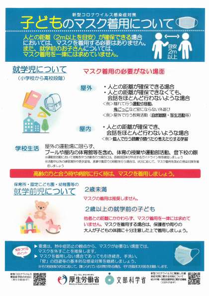 6月も半ばとなり、気温が高い日が続いています。学校では、熱中症の予防のため、体育の時間や登下校時などマスク着用の有無について状況に応じて指導しています。ご家庭におかれましても、夏場におけるマスクの着用について、ご配意いただきますようお願いします。厚生労働省及び文部科学省からリーフレットが出ていますので、ご覧ください。