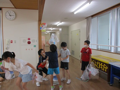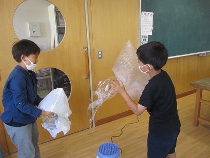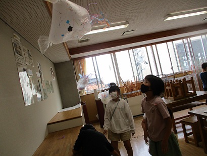 上向きの風の力を使って、浮かんだり動いたりする作品づくりに取り組みました。子供たちは、予想外の反応をする作品におもしろさを感じ取りながら、さらに工夫を加えて作ることを楽しんでいました。