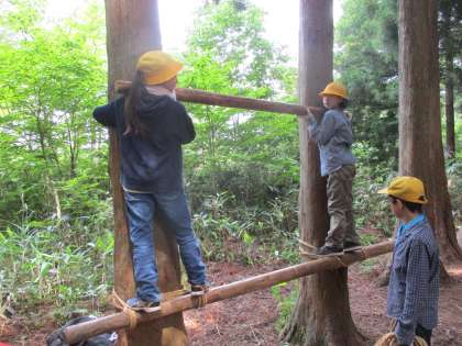 丸太や縄を組み合わせて遊び場をつくりました。最後は違うグループの友達の遊び場を交流して楽しみました。