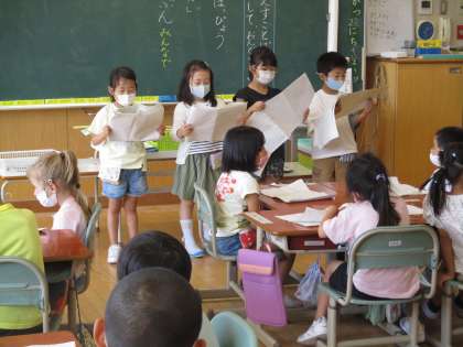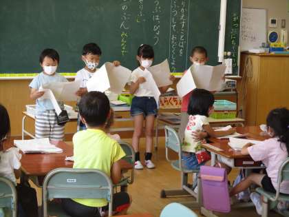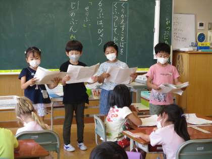 1組では、「大きなかぶ」の音読発表会をしました。繰り返し出てくる言葉をどのように読んだらいいか話し合い、それぞれのグループで工夫しながら音読しました。
