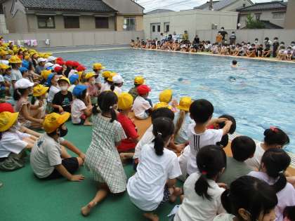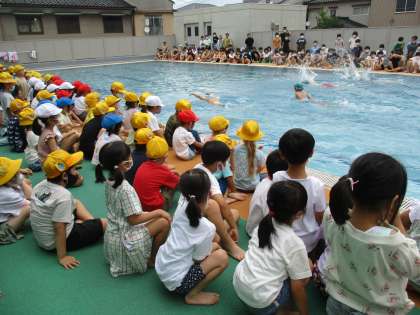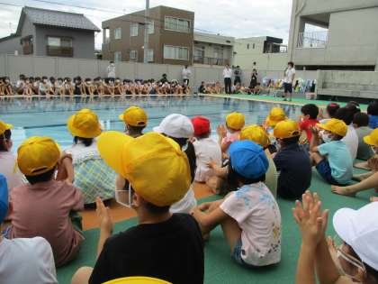 1時間目にプール開きの式が行われました。プールでの安全の約束を確認したり、6年生の模範泳法を見学したりしました。6年生の模範泳法では、クロール、平泳ぎ、背泳ぎ、バタフライと、次々に素晴らしい泳ぎを目の当たりにし、自然と拍手や感嘆の声が出ていました。