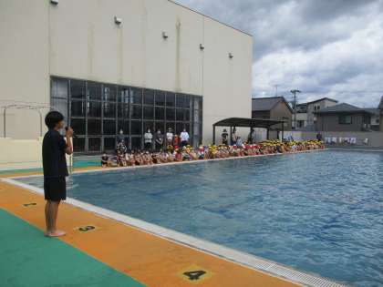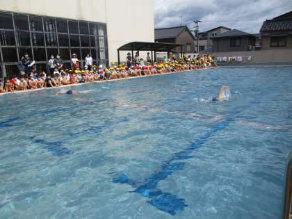 待ちに待ったプール開きです。運動委員長が挨拶をしたり、個人メドレーで模範泳法をしたりと、最高学年らしい堂々とした姿がありました。安全に気をつけて、楽しい水泳学習が始まります。