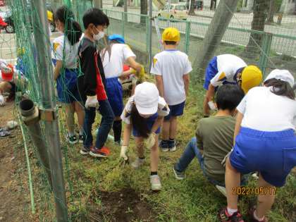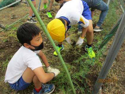 理科と総合的な学習の時間の一環として、自分たちで農園を作り、植物を育てる活動を行っています。自分たちで作ったものを自分たちで食べる「自給自足」や大きく茂った葉やつるを生かした「グリーンカーテン作り」など、環境に配慮した栽培活動を目指しています。