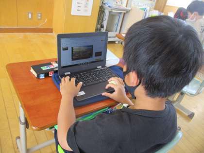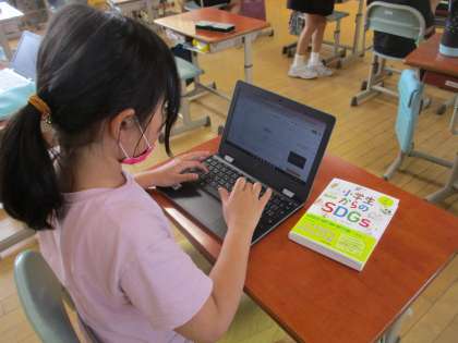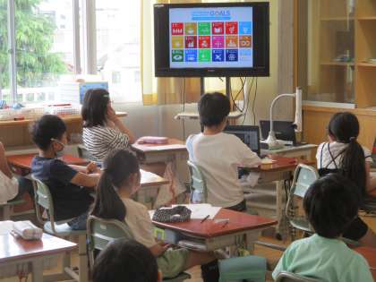 富山の水がきれいでおいしい理由を知った後、世界にはきれいで安全な水を飲むことができない人がいることを伝えました。子供たちは真剣な表情で話を聞き、すぐに自分たちにできることはないか考え、調べ始めました。「西田地方から世界の水をきれいにしよう、ごみをなくそう」と呼びかける場面もあり、身近な環境から世界・地球の環境へと視野を広げることにつながりました。
