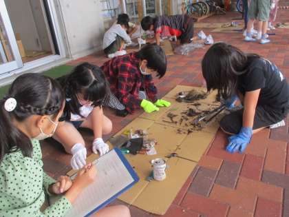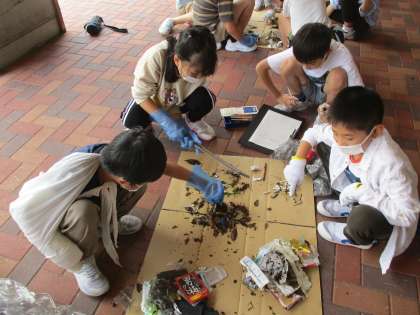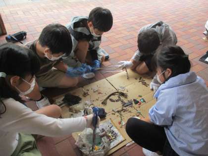 拾ってきたごみを分別しながら、どのようなごみが何個あったか、改めて数えました。ごみを広げ、もう一度分けて数えて見ることで、拾っていたときには気付かなかったようなことを見つけるなど、よい分析の時間となりました。