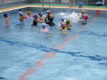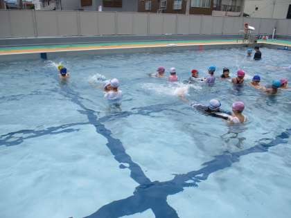 シャワーを苦手とする子供たちは多いですが、プールの中では、歓声をあげながら楽しそうに泳ぎの練習をしたり、友達と自由時間を楽しんだりしています。
