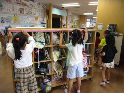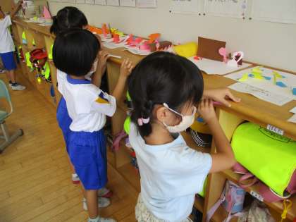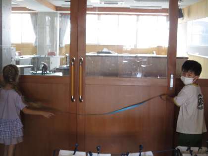 「どちらがながい」の学習で、紙テープを使って長さを比べる学習をしました。「そっちの方を持って。」「長いね〜。」など言いながら、友達と一緒に協力し合って、様々な部分の長さを調べました。