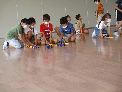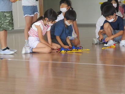 ゴムの力を利用して動く車を使って、ゴールインゲームをしました。100点のところに車を止めるためにどのくらいゴムを伸ばせばよいのか、子供たちはグループでいろいろ試しながら活動していました。