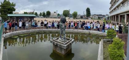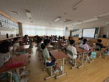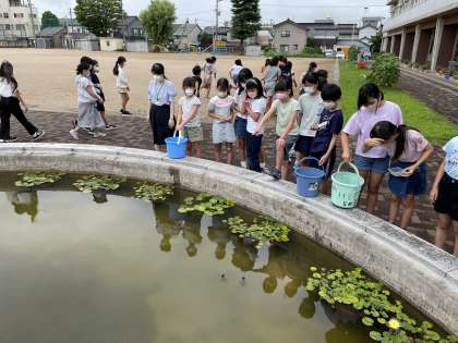 あっという間の1学期でしたが、姿勢を正して終業式に参加する姿に成長が感じられました。その後、5年生全員で校内の観察池に行き、メダカの親子を放しました。子供たちもメダカたちも、今後ますます成長していってくれることを願っています。