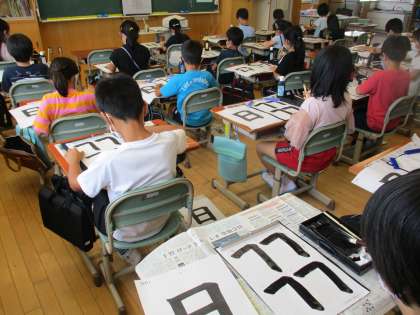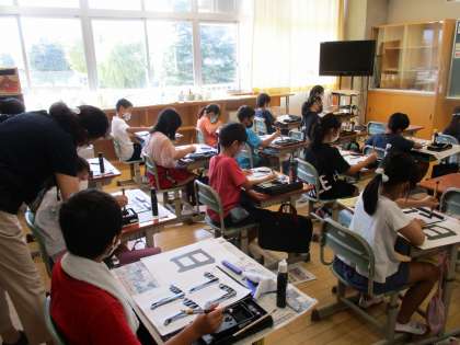 書写では、毛筆で「日」の字を書きました。毛筆で初めて取り組む「折れ」を練習し、筆の動かし方に気をつけながら、一画一画丁寧に書きました。