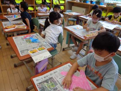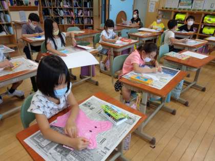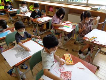 「いろいろな形から」の学習をしました。様々な形に切られた7種類の紙から1枚選び、何に見えるか想像を膨らませて絵に表していく活動です。子供たちは、自分の思い付きに目を輝かせながら、大人の想像を遙かに超える素敵な作品づくりに取り組んでいました。