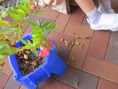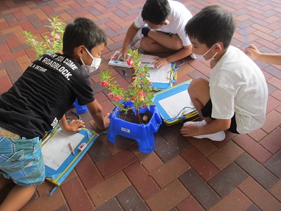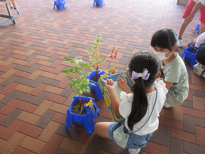 夏休み中も観察を続けたホウセンカは、花や実ができています。子供たちは、色や形の変化を見たり実に触ったりしていました。「実が意外とやわらかいな。」と感じた子供が多くいました。実物を観察することの大切さを実感しました。