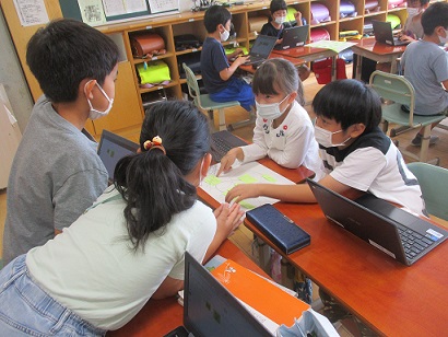 「山小屋で三日間すごすなら何を持っていくか」という話題で、グループでの話し合い活動をしました。意見の整理の仕方を学習し、どのグループも、みんなで考えを広めたりまとめたりする話し合いをしていました。