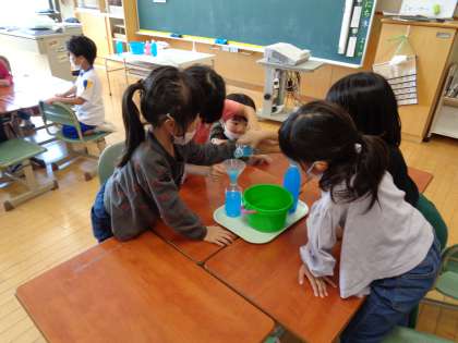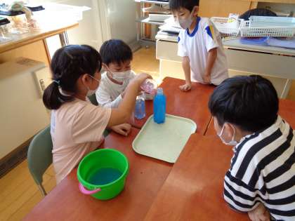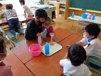 「どちらがおおい」の学習が始まりました。「背が高いから、こっちの方が多いと思うよ。」「太いからこっちだと思う。」など予想もそれぞれです。どうしたら比べることができるか思考を巡らせながら、友達と協力し合って調べていました。