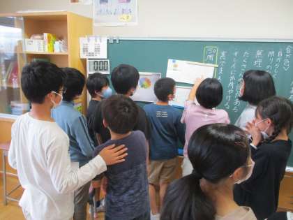 運営委員会では、創立150周年記念のロゴマークについて話し合っています。「校章の菊をイメージした形がいいね」「いろいろな色があったほうがいいな」など、運営委員全員で意見を交わしながら制作アイディアを出しています。