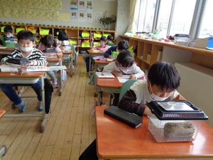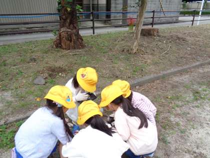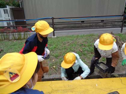 布瀬公園で「虫見つけ」をしました。「声は聞こえるけどなあ。」「学校の周りの方がたくさんいるんじゃないかな。」「葉っぱの下に隠れていたよ。」など、友達と情報交換をしながら、生き物のいそうな場所を探しました。「ミミズって虫じゃないの?」「これはダンゴムシ?ワラジムシ?」という友達の疑問に、一緒に考えたり、答えたりする1年生らしいやりとりも見られました。