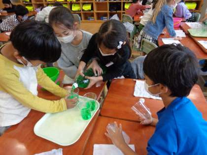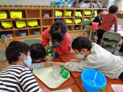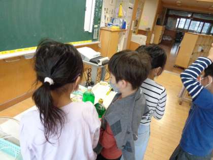 「どちらがおおい」の学習では、子供たちはどうすれば比べられるか、いろいろな比べ方を考えたり試したりしてきました。休み時間にも、水の周りに集まり、「同じじゃないかな」「こっちの凹みを見てみようよ」「本当に太さや高さは同じなのかな」などと言いながら、自発的に友達と比べ合っている姿も見られました。