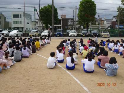給食室から出火を想定した避難訓練が行われました。休み時間中の訓練ということもあって、子供たちは放送をよく聞いて、それぞれの場所から安全に避難することができました。「お・は・し・も」を守り、真剣に取り組んでいました。