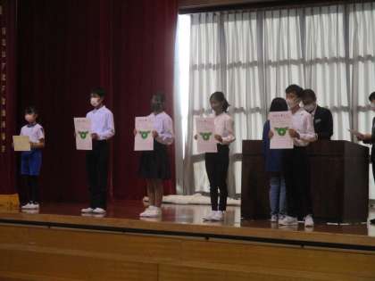 受賞伝達がありました。チャレンジ陸上記録会で好記録を残した6年生の子供たちにも、賞状が渡されました。校長先生から記録を読み上げてもらうと、下級生から驚きの声が上がっていました。