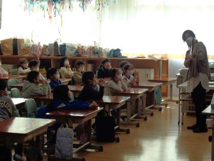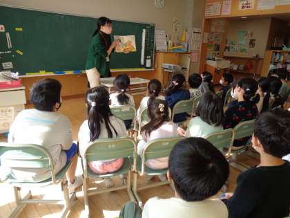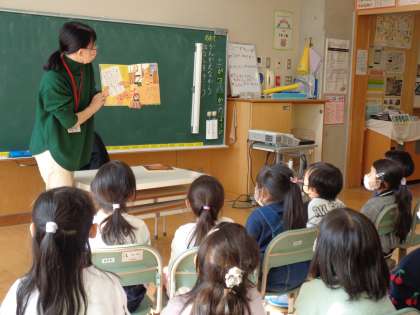 今日は「おはなしゆうびんやさん」の方の読み聞かせがありました。子供たちは、読んでいただいた「いいからいいから」「たぬきのひみつ」の本がとても気に入ったようで、「え〜」と驚いたり「面白いから、もう一回読んで欲しいな」と言ったりしていました。最後には「また来てください」とお願いしていて、楽しい時間になったようです。