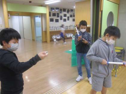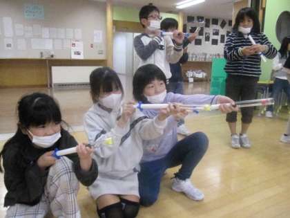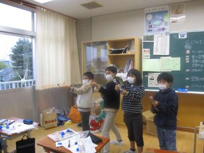 理科の学習に、「とじこめた空気と水」の実験をしました。スポンジが遠くに飛んでいく様子を楽しそうに眺める子供たち。どうして飛んでいくのかを予想を立て実験に臨んでいました。