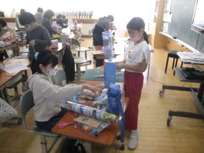 NSDGs委員会で引き続き活動を行っています。図画工作科の授業には、「これでえがくと」をさらに発展させ立体的なエコアートに挑戦しています。身近にあるゴミを再利用してアート作品を作っています。